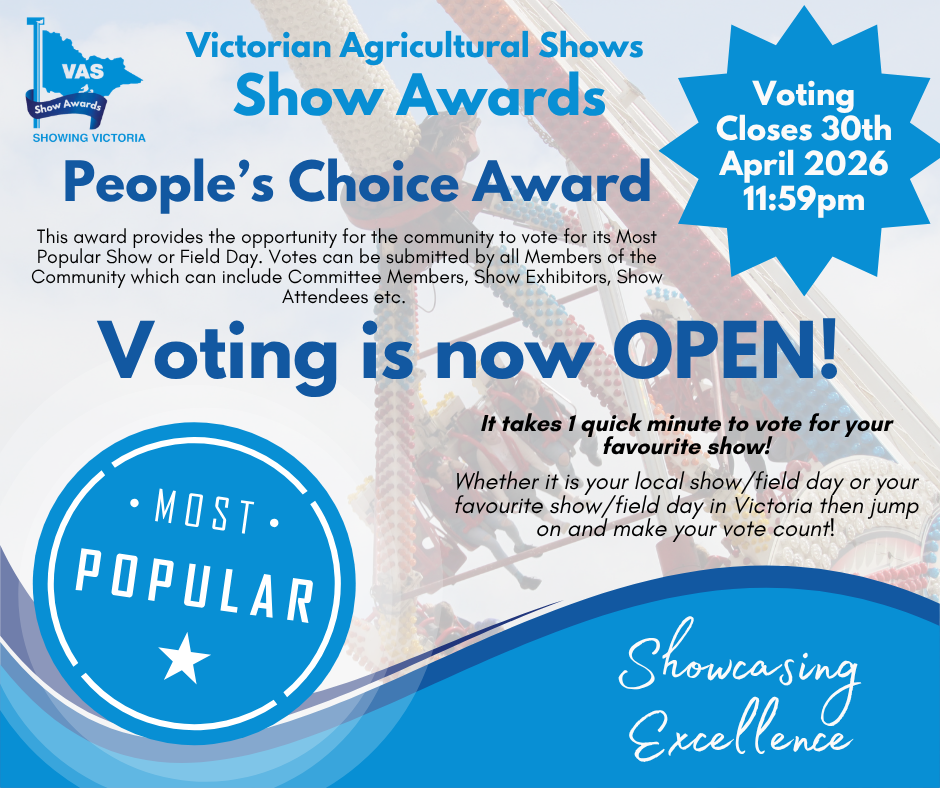 The Victorian Agricultural Shows Awards serve to recognise excellence in the agricultural show movement and is an initiative supported by the VAS Ltd Board & Sub Committee. The Awards will acknowledge the contributions of not just the Show Societies/Field Days and events hosted by them, but the people whose tireless efforts embody what the agricultural show movement is all about. It also aims to encourage teams and individuals to innovate and maintain their commitment to achieving excellence.